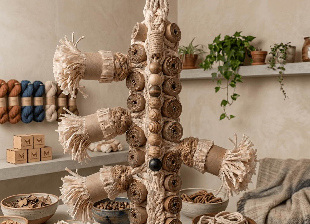 Our team of Chaos Wranglers has engineered a high-tension suspension system for the high-hopping elite who think the floor is just a suggestion. The Bun-Gee Jumper isn’t just a toy; it’s a vertical gravity-defier that upcycles humble paper rolls into a braided obstacle course for the “interior design by tooth” crowd. This puzzle is a total Mojo Projects creation, combining rugged, untreated fiber with tight-rolled cardboard armor and fringed tassels to create a multi-level challenge.